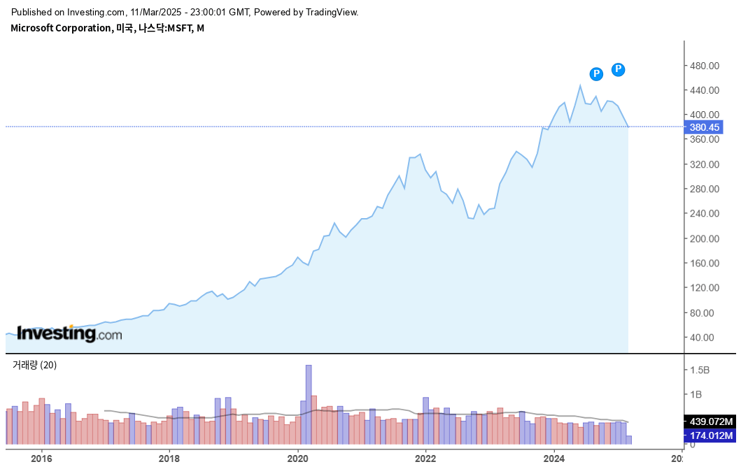 마이크로소프트(MSFT)의 주가는 지난 10년 동안 지속적인 상승세를 보였습니다. 2015년 12월 31일, 주가는 약 55.48달러였으며, 2025년 3월 11일 현재 약 380.45달러로 상승하였습니다. 이는 약 585%의 상승률을 나타냅니다.